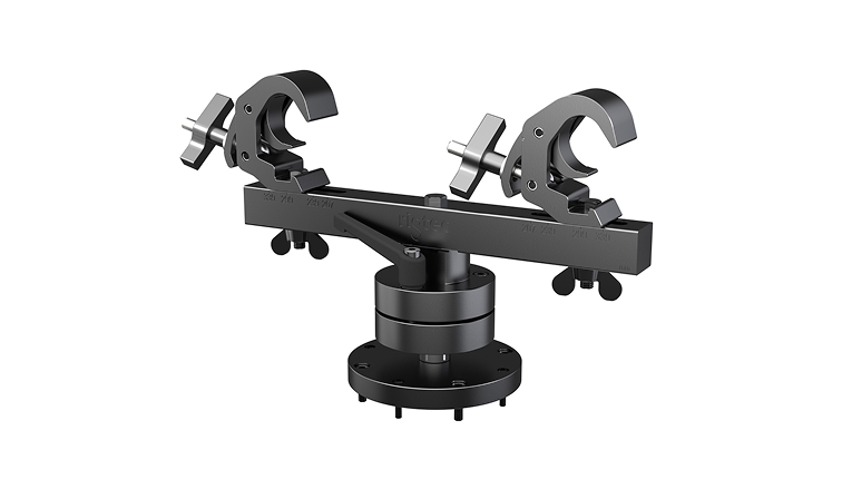 The Atom Grip Duo offers a simple solution for twin point projector hanging, with captive fixings it can be easily attached to a projector rental frame. Angled adjustments can be achieved via the ratchet handle, moving the handle to the right loosens the mechanism to allow 25° tilt and 360° rotation. Moving the handle back to the right locks the adjustments in position.