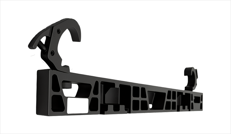 A 2‑wide hanging/header bar used at the top of flown BP2 builds. It spans two cabinets and offers clamp mounting for fast, consistent truss rigging.