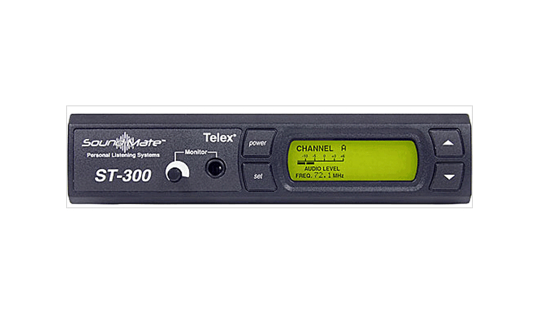 The Telex ST-300 is a personal and assistive listening wireless base transmitter, featuring 17 user selectable frequencies in the VHF band. The unit is equipped with a comprehensive set of front-mounted control buttons, a backlit LCD display, a headphone jack with an adjustable level knob for input signal monitoring, and a peak reader on the LCD display for visual input monitoring.